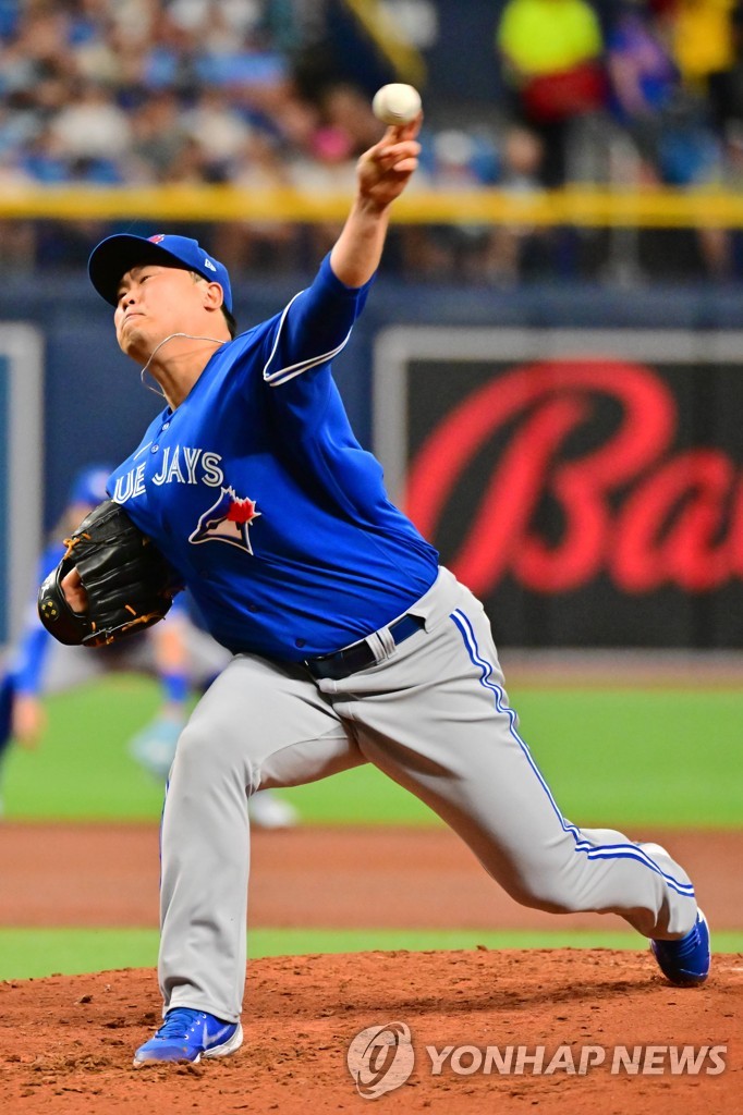 | ▲ In this USA Today Sports photo via Reuters, Ryu Hyun-jin of the Toronto Blue Jays pitches against the Tampa Bay Rays during the bottom of the second inning of a Major League Baseball regular season game at Tropicana Field in St. Petersburg, Florida, on May 14, 2022. (Yonhap) |