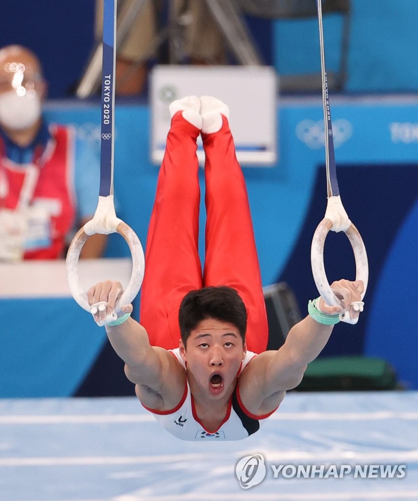 | ▲ South Korean artistic gymnast Ryu Sung-hyun performs on the rings during the men's qualification round of the Tokyo Olympics at Ariake Gymnastics Centre in Tokyo on July 24, 2021. (Yonhap) |