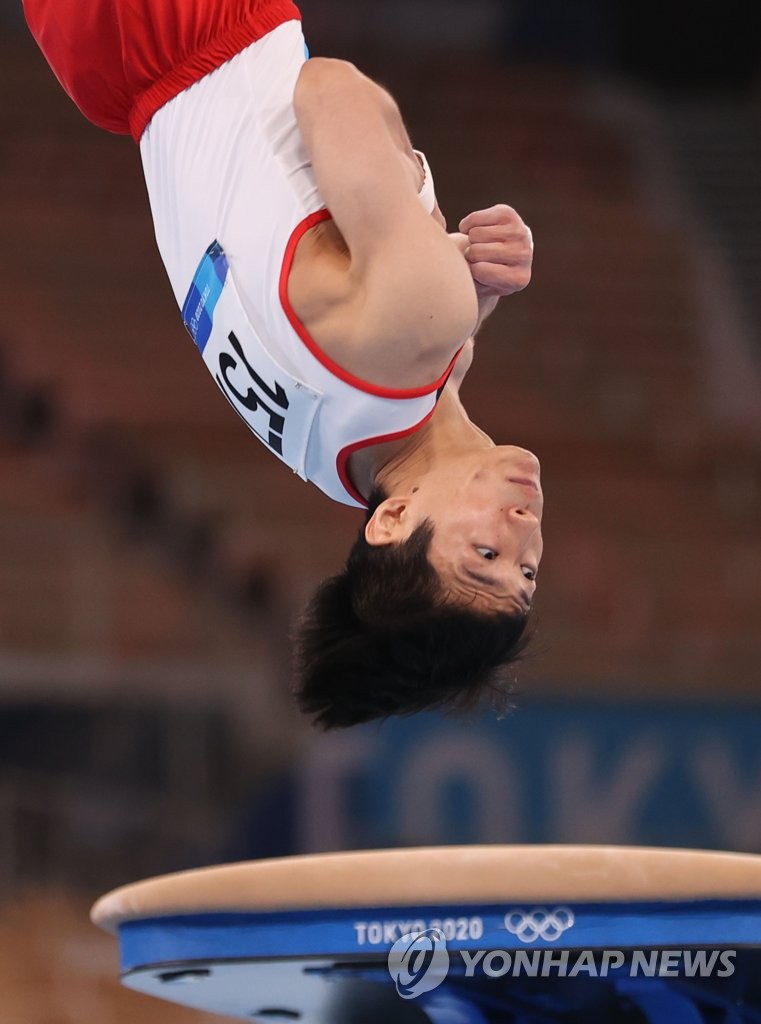 | ▲ South Korean artistic gymnast Yang Hak-seon performs his vault routine during the men's qualification round of the Tokyo Olympics at Ariake Gymnastics Centre in Tokyo on July 24, 2021. (Yonhap) |