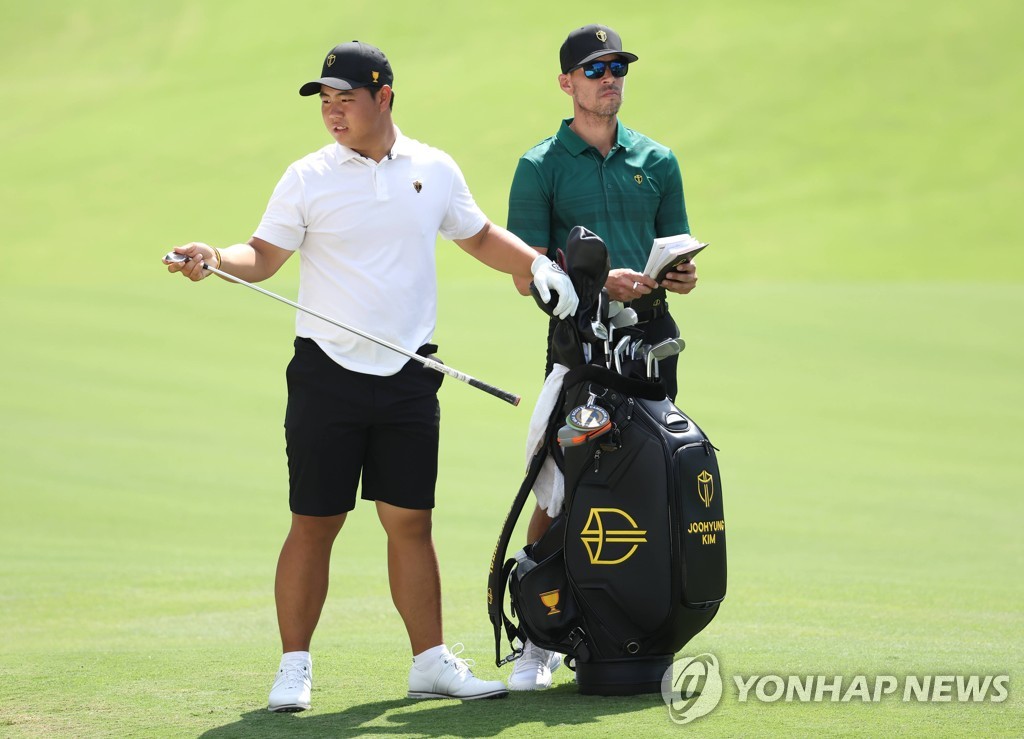 | ▲ 프레지던츠컵 대회를 앞두고 훈련하는 김주형(왼쪽) [AFP=연합뉴스] |