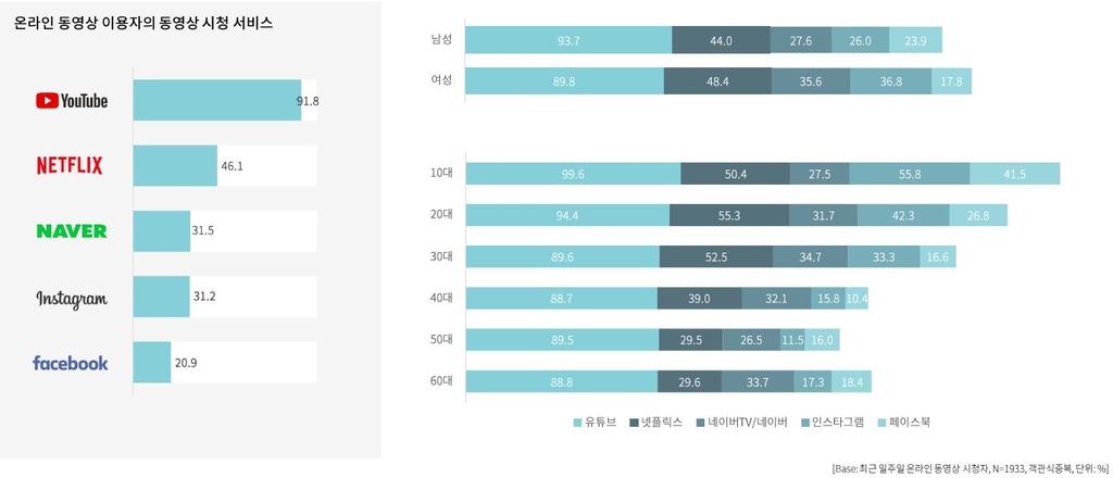 온라인 동영상 시청 채널은 유튜브가 91.8%로 1위였고, 이어 넷플릭스(46.1%), 네이버(31.5%), 인스타그램(31.2%) 등의 순이었다.