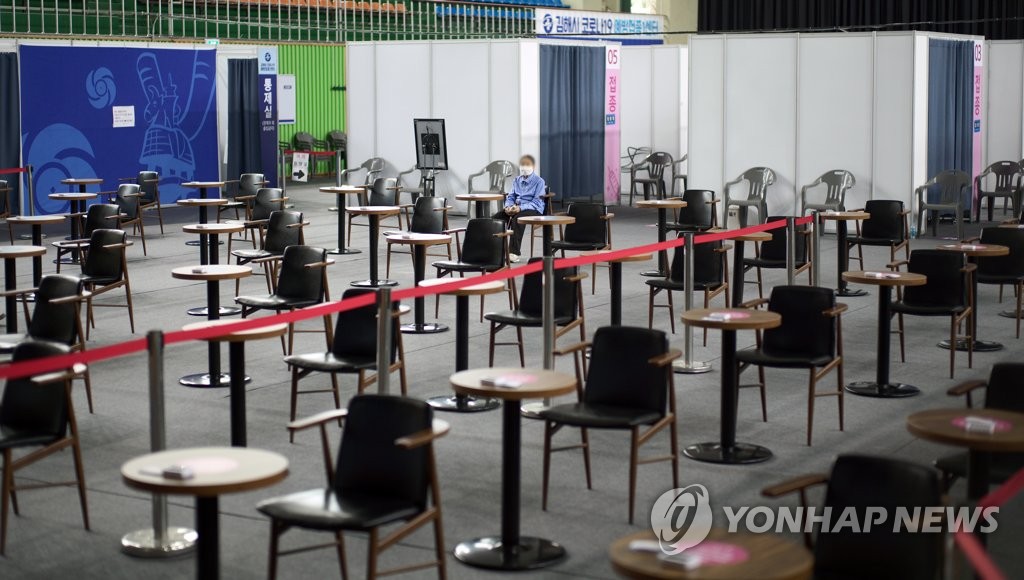 | ▲ A man waits to see if he has any side effects from COVID-19 vaccination after receiving a shot at a makeshift vaccination center in Gimhae, South Gyeongsang Province, on May 10, 2021. (Yonhap) |
