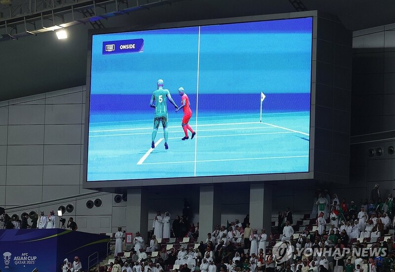 | ▲ 심판 눈보다 정확했던 SAOT (도하=연합뉴스) 김도훈 기자 = 16일(현지시간) 카타르 도하 칼리파 인터내셔널 스타디움에서 2023 아시아축구연맹(AFC) 아시안컵 조별리그 F조 사우디아라비아 대 오만의 경기에서 스크린에 반자동 오프사이드 판독 기술(SAOT) 판독 결과가 나오고 있다. 2024.1.17 superdoo82@yna.co.kr |
