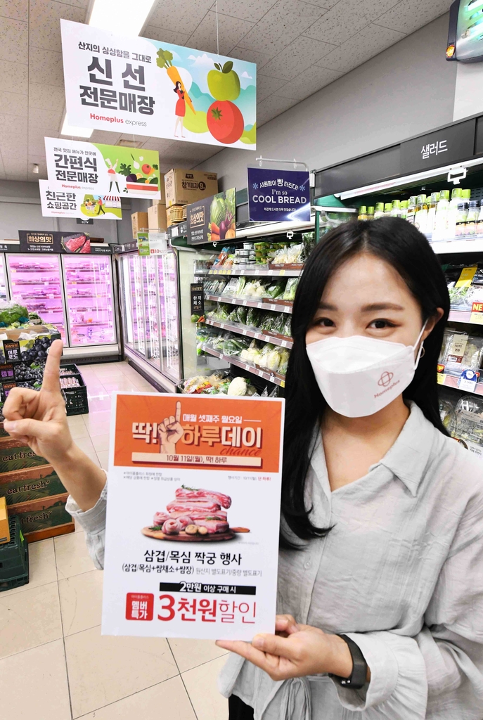 기업형 슈퍼마켓인 홈플러스 익스프레스는 한글날 대체공휴일인 11일 '딱 하루데이' 행사를 통해 돼지고기, 채소, 과일 등을 저렴하게 판매한다.