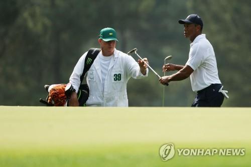 | ▲ 마스터스 때 우즈에게 퍼터를 건네는 라카바. [AFP/게티이미지=연합뉴스] |