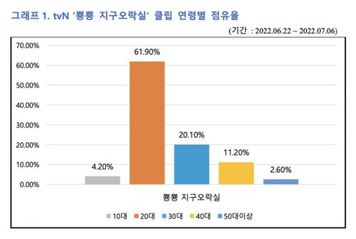 '뿅뿅 지구오락실'의 클립 영상 연령별 점유율 분포를 보면 20대가 61.9%, 30대가 20.1% 점유율을 차지했다.