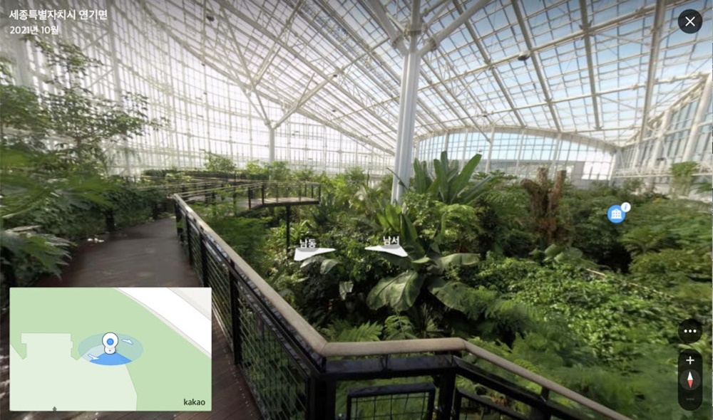 카카오맵에서 '국립세종수목원'을 검색한 뒤 로드뷰 아이콘을 클릭하면 서비스 제공 구간이 파란색으로 활성화하며, 원하는 지점을 클릭하면 비대면으로 수목원을 관람할 수 있다.