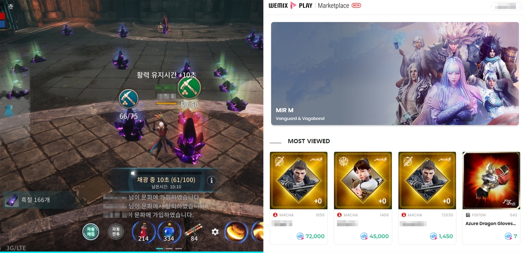 | ▲ '미르4'에서 흑철 캐는 모습(왼쪽)과 위믹스 플랫폼 내에서 거래되는 캐릭터 NFT [미르4 플레이 화면 캡처·위믹스플레이 캡처] |