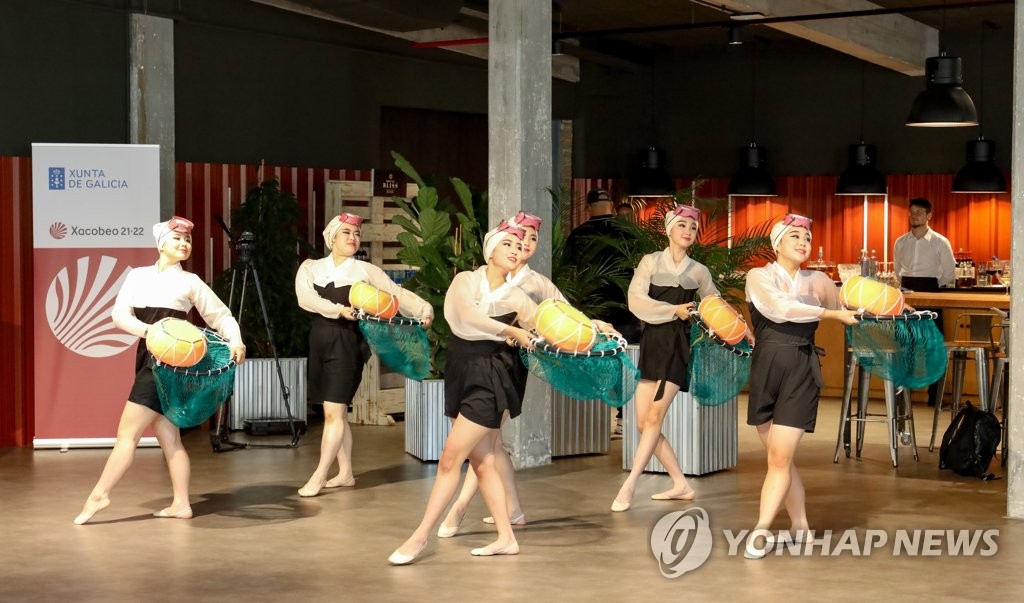 | ▲ 스페인에서 공연되는 제주 해녀 춤 (제주=연합뉴스) 12일 스페인 대표 도보여행 코스인 산티아고 순례길의 아레카에서 제주 상징물인 돌하르방과 제주올레길 상징물인 간세 설치 기념행사가 열린 가운데 제주 해녀들의 공연이 펼쳐지고 있다. 2022.7.13 [제주도 제공. 재판매 및 DB 금지] koss@yna.co.kr |