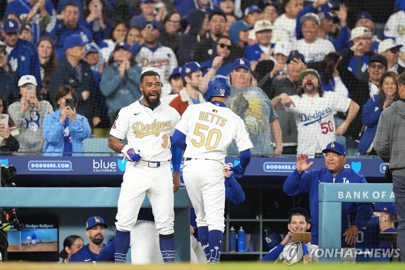 | ▲ 8회 홈런을 치고 더그아웃으로 향하는 베츠(50번) [로이터=연합뉴스] Mandatory Credit: Kirby Lee-Imagn Images |