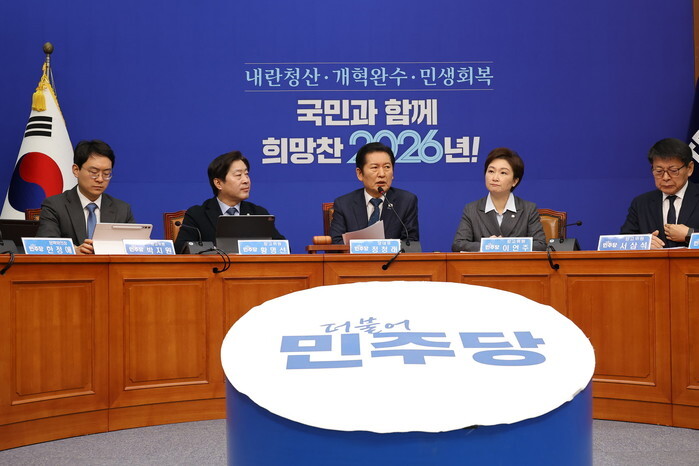Jung Chung-rae (C), leader of the ruling Democratic Party (DP), attends a meeting of its Supreme Council at the National Assembly in Seoul on Jan. 2, 2026, a day after the party took a measure to expel lawmaker Kang Sun-woo despite her earlier decision to leave the party amid allegations that she received 100 million won (US$69,400) from a Seoul city councilor in 2022. (Yonhap)