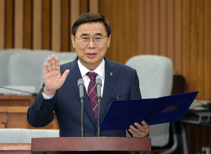 National Intelligence Service chief nominee Lee Jong-seok takes an oath during his confirmation hearing at the National Assembly in Seoul on June 19, 2025. (Yonhap)