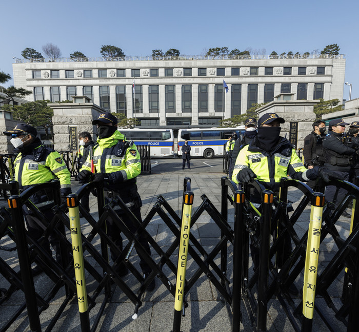 Police officers stand guard in front of the Constitutional Court in Seoul on March 11, 2025, as no specific date has yet been set for the court's ruling on whether to uphold or dismiss President Yoon Suk Yeol's impeachment in connection to his short-lived imposition of martial law in December. (Yonhap)