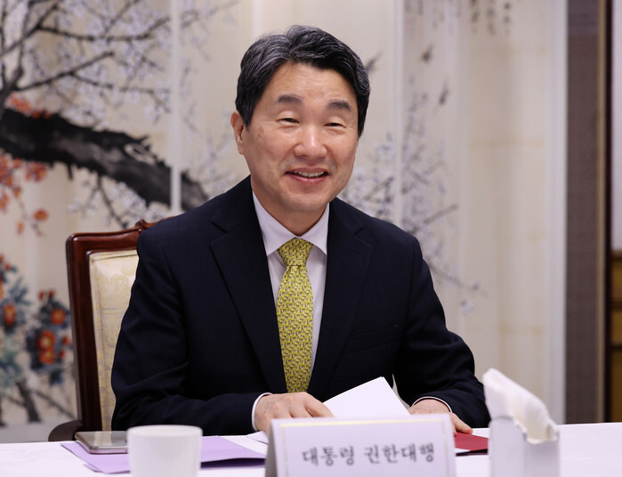 Acting President and Deputy Prime Minister Lee Ju-ho attends a meeting of the task force for strategies of economic security at the government complex in Seoul on May 19, 2025, in this photo released by the education ministry. (PHOTO NOT FOR SALE) (Yonhap)