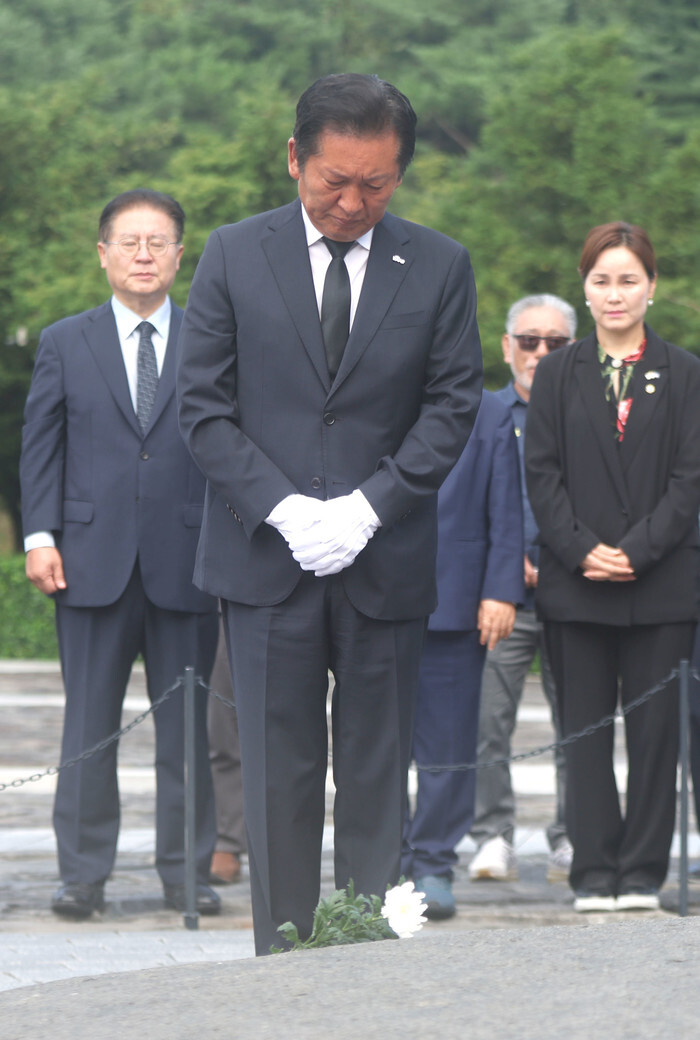 Jung Chung-rae, leader of the ruling Democratic Party, pays tribute to late President Roh Moo-hyun at Roh's tomb in Gimhae, South Gyeongsang Province, southeastern South Korea, on Aug. 7, 2025. (Yonhap)