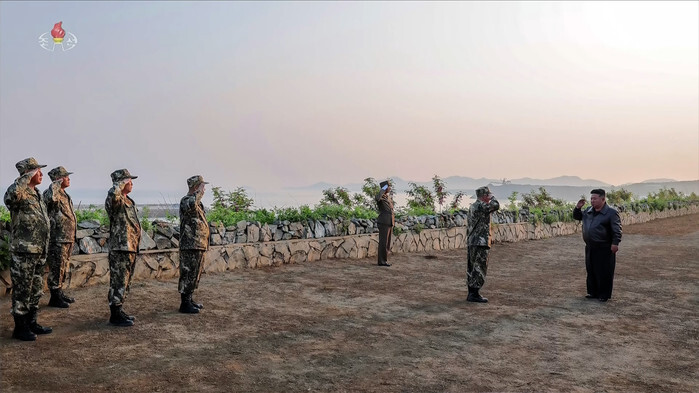 North Korean leader Kim Jong-un (R) receives salutes from soldiers as he inspects a firing contest among artillery subunits of large combined units of the Korean People's Army at an unspecified location on May 29, 2025, in this photo captured from the North's Korean Central Television the next day. (For Use Only in the Republic of Korea. No Redistribution) (Yonhap)