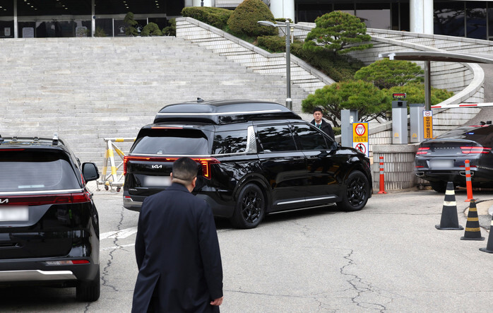 A minivan (rear) carrying ousted President Yoon Suk Yeol enters the underground parking lot of Seoul Central District Court's compound in the capital on April 14, 2025, before Yoon attends the first hearing of a trial over insurrection charges in connection with his declaration of martial law. (Pool photo) (Yonhap)