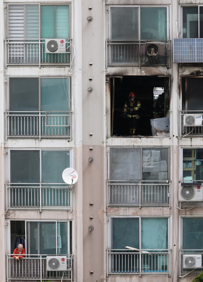 This April 21, 2025, photo shows a unit in an apartment complex in Seoul's Gwanak Ward where a fire earlier in the day killed a resident and injured 11 others. (Yonhap)