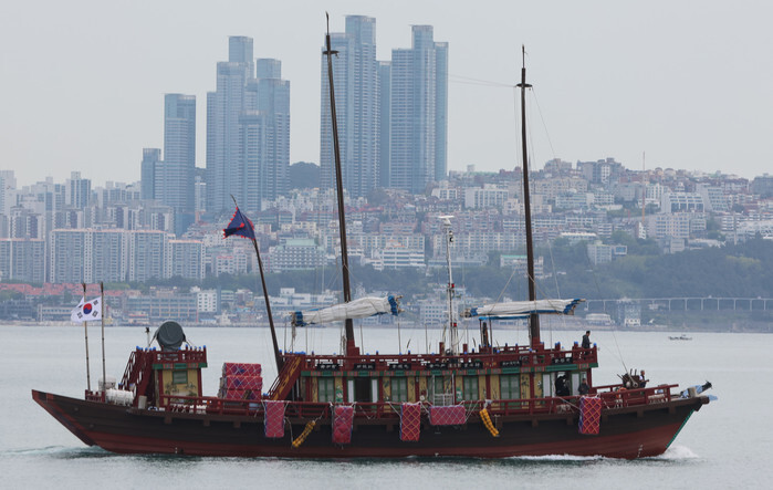 A replica ship of the Joseon Tongsinsa, a diplomatic delegation sent by the Joseon Dynasty (1392-1910) to Japan, leaves a port in the southeastern city of Busan on April 28, 2025, for Osaka, western Japan, as part of events to mark the 60th anniversary this year of diplomatic ties between South Korea and Japan. The dispatch of the Korean envoys began in 1607 for political reasons to promote peace after a destructive seven-year war between the two sides, but its functions were later transformed into something more cultural. A total of 12 such teams of envoys were dispatched until 1811. (Yonhap)