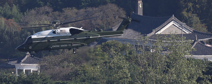 Marine One carrying U.S. President Donald Trump takes off from a heliport in Gyeongju, North Gyeongsang Province, southeastern South Korea, on Oct. 30, 2025, as he travels to the nearby city of Busan to hold talks with Chinese President Xi Jinping later in the day. (Yonhap)
