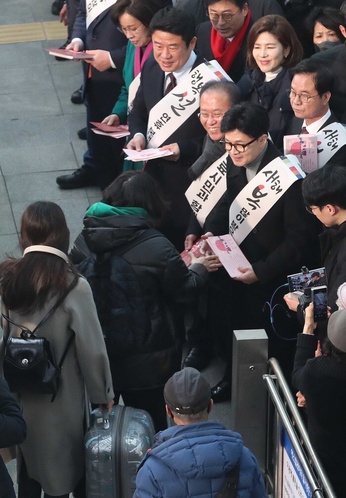 The leadership of the ruling People Power Party, including the party's interim leader, Han Dong-hoon (2nd from R), sees off people heading to their hometowns at Seoul's Yongsan Station on Feb. 8, 2024, as South Korea's annual exodus for Seol, Lunar New Year's Day, begins. The holiday, which runs from Feb. 9-12 this year, is a time for family reunions, with Koreans traditionally offering a ritual feast to their ancestors. (Pool photo) (Yonhap)