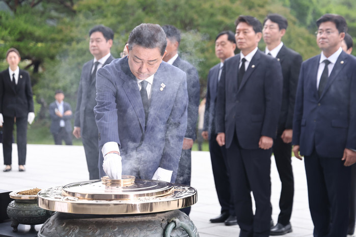 Kim Byung-kee, new floor leader of the ruling Democratic Party, burns incense to pay tribute to South Korean patriotic martyrs and war dead at the National Cemetery in Seoul on June 16, 2025. (Yonhap)