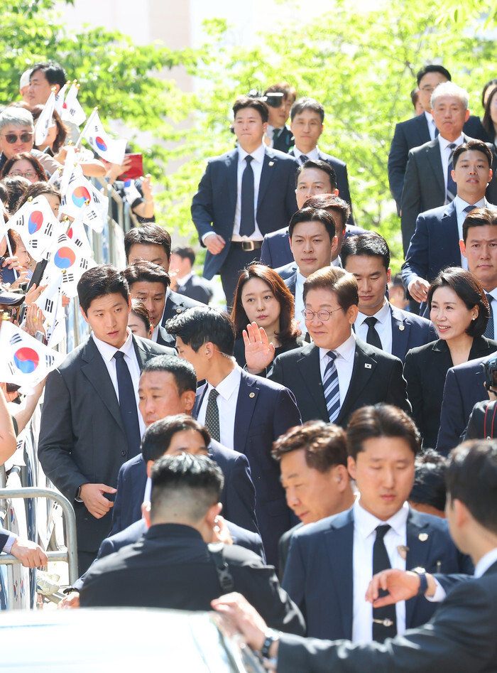 South Korea's newly elected President Lee Jae-myung (C) waves as he leaves his residence in Incheon, west of Seoul, on June 4, 2025, ahead of his inauguration ceremony later in the day. (Yonhap)
