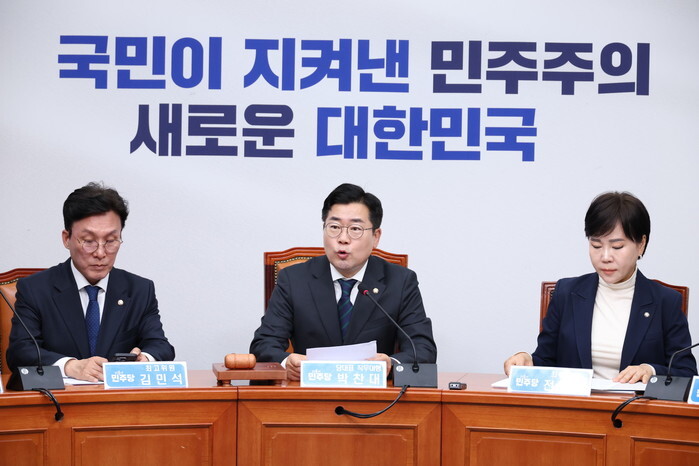 Park Chan-dae (C), acting leader of the liberal Democratic Party, speaks during a meeting of the party's Supreme Council at the National Assembly in Seoul on April 21, 2025, in this photo released by the party. (PHOTO NOT FOR SALE) (Yonhap)