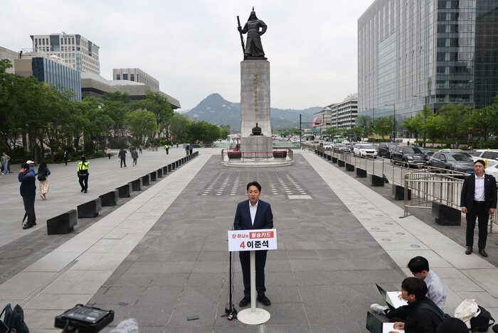 Lee Jun-seok, the presidential candidate of the minor conservative New Reform Party, holds a press conference at Gwanghwamun Plaza in Seoul on May 19, 2025, ahead of the June 3 presidential election. (Yonhap)