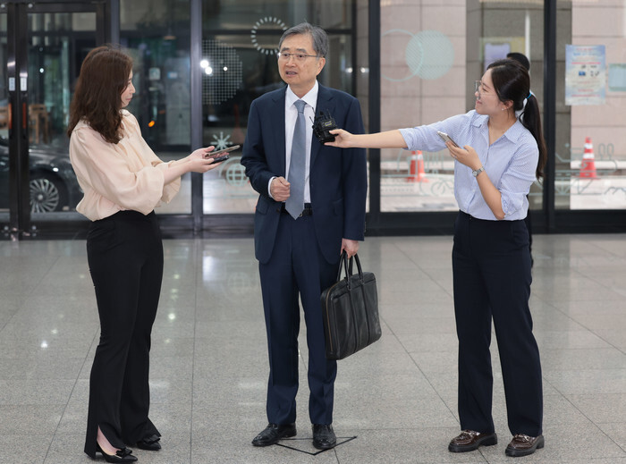Cho Hyun (C), nominated by President Lee Jae Myung as the foreign minister, speaks to reporters as he arrives at his temporary office in Seoul on June 24, 2025, to prepare for his parliamentary confirmation hearing. (Yonhap)