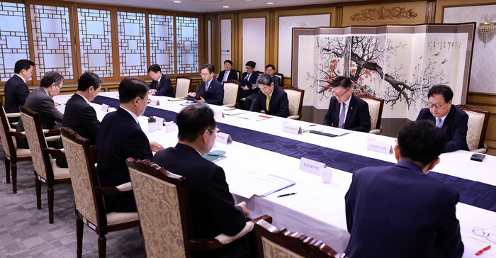 Acting President and Deputy Prime Minister Lee Ju-ho (C, rear) attends a meeting of the task force for strategies of economic security at the government complex in Seoul on May 19, 2025, in this photo released by the education ministry. (PHOTO NOT FOR SALE) (Yonhap)