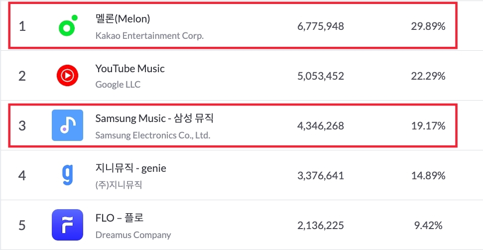멜론의 MAU는 안드로이드 및 iOS의 이용자 수를 합산해 총 677만 명을 기록했다. 유튜브뮤직은 MAU 505만 명으로 2위, 삼성뮤직은 434만 명으로 3위, 지니뮤직은 337만 명으로 4위, 플로는 213만 명으로 5위에 올랐다.