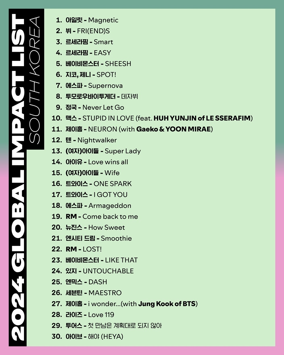 리스트는 2024년 1∼6월 발매된 한국 아티스트 음원을 대상으로 상반기 한국을 제외한 국가에서 가장 많이 스트리밍한 음원 30곡을 선정했다.