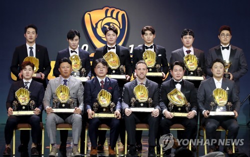 | ▲ 2019년 KBO를 빛낸 선수들 2019년 12월 9일 서울 코엑스 오디토리움에서 열린 2019 KBO 골든글러브 시상식에서 수상자들이 단체사진을 촬영하고 있다. 앞줄 왼쪽부터 NC 박민우(2루수), kt 로하스(외야수) 대리수상 김강 코치, 키움 샌즈(외야수) 대리수상 홍원기 코치, 두산 린드블럼 (투수), NC 양의지(포수), 두산 페르난데스(지명타자) 대리수상 배영수 뒷줄 왼쪽부터 SK 박종훈 (사랑의골든글러브), 키움 김하성(유격수), 키움 박병호(1루수), 키움 이정후(외야수), SK 최정(3루수), LG 채은성(페어플레이). [연합뉴스 자료사진] |