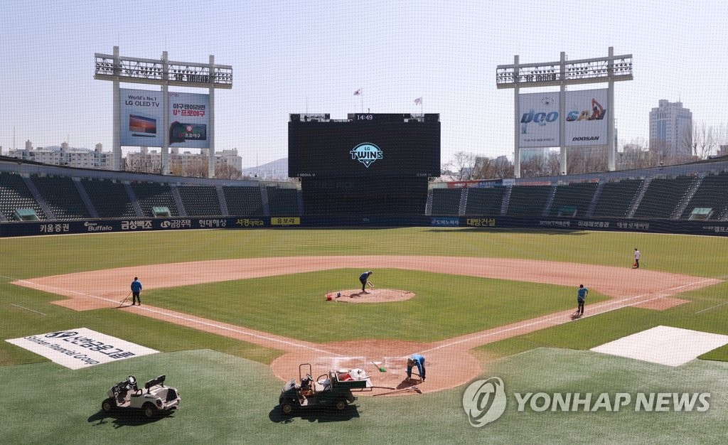 | ▲ Groundskeepers work on the field at Jamsil Baseball Stadium in Seoul following a Korea Baseball Organization preseason game between the SSG Landers and the LG Twins on March 30, 2021. (Yonhap) |