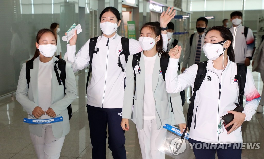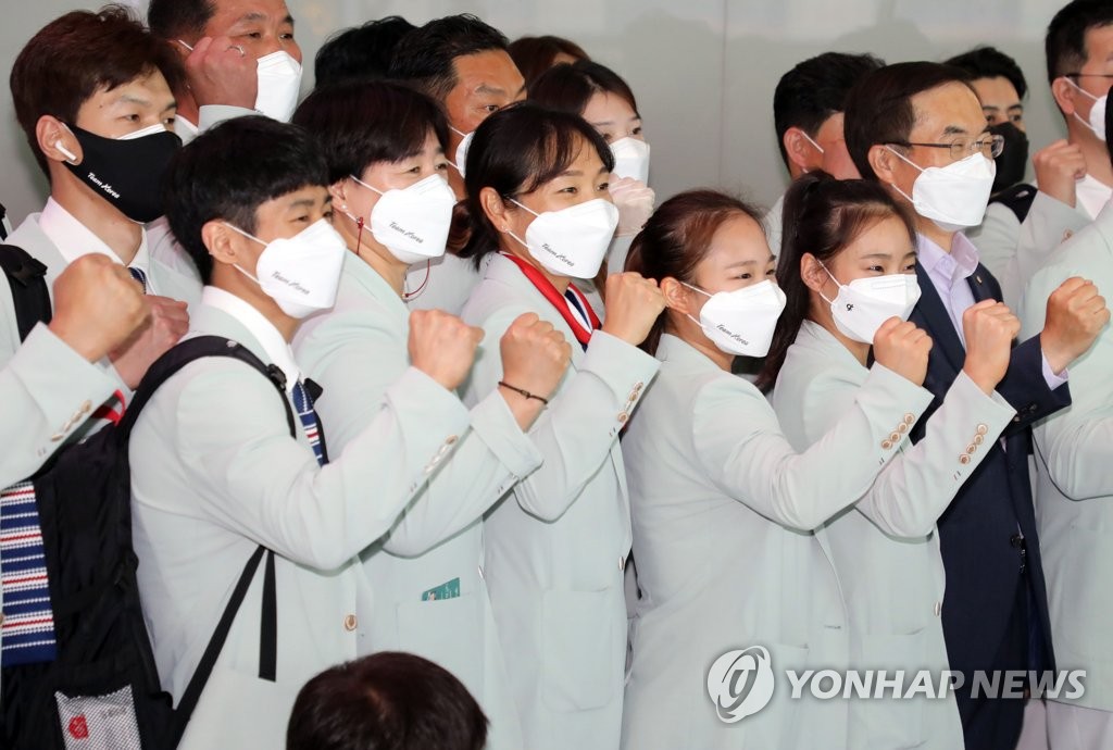 SEOUL, July 19 (Yonhap) -- The main South Korean delegation to the Tokyo Olympics departed for Japan on Monday, four days ahead of the opening ceremony for the competition delayed one year by the coronavirus pandemic.
