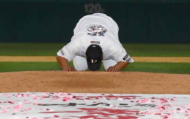 | ▲ 마운드에 입 맞추는 채병용 SSG 랜더스 채병용이 3일 인천 SSG 랜더스필드에서 열린 은퇴식에서 마운드에 입을 맞추고 있다. [SSG랜더스 제공. 재배포 및 DB금지] |