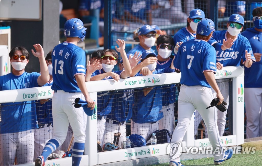 | ▲ 앞서가는 삼성 (서울=연합뉴스) 홍해인 기자 = 3일 오후 서울 잠실야구장에서 열린 2021 프로야구 삼성 라이온즈와 두산 베어스의 경기. 1회초 무사 주자 만루에 삼성 오재일의 2타점 적시타 때 홈을 밟은 김상수와 박해민이 더그아웃에서 팀 동료들과 하이파이브를 하고 있다. 2021.10.3 hihong@yna.co.kr |
