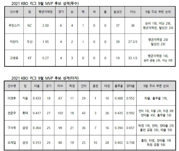 | ▲ KBO리그 9월 MVP 후보의 주요 성적 [KBO 제공. 재판매 및 DB 금지] |
