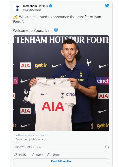 토트넘은 5월 31일(한국시간) 홈페이지에 "경험이 풍부한 크로아티아 국가대표 페리시치가 인터 밀란(이탈리아)과 계약이 만료되고 나서인 7월 1일 우리 클럽에 합류한다"면서 "2024년까지 계약에 합의했다"고 밝혔다.