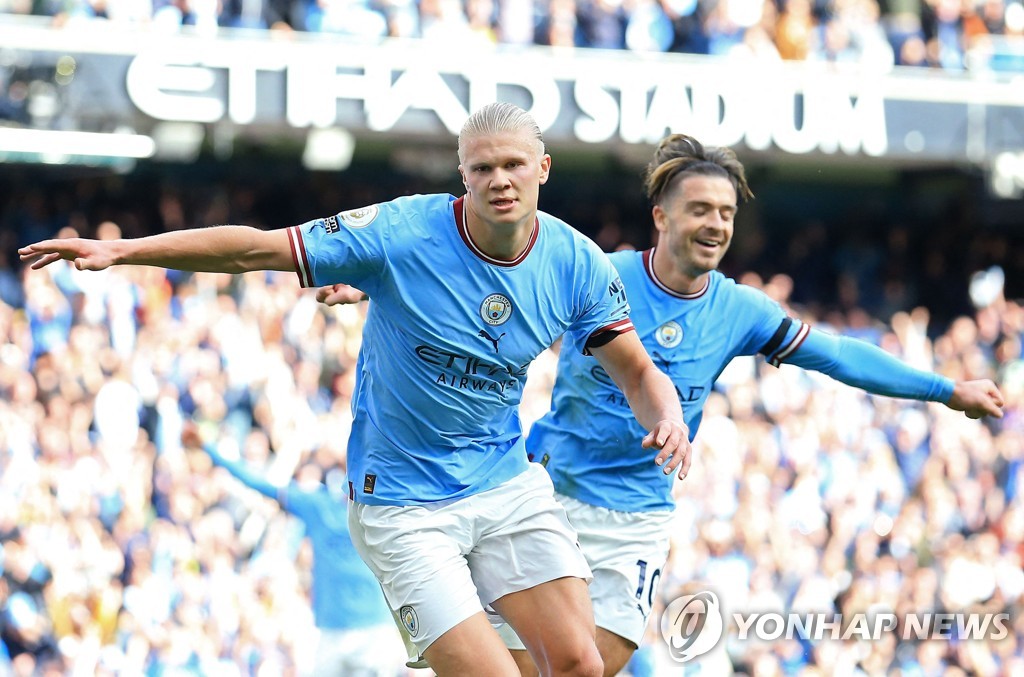 (서울=연합뉴스) 안홍석 기자 = 잉글랜드 프로축구 프리미어리그(EPL) 맨체스터 시티(맨시티)의 '괴물 공격수' 엘링 홀란(22·노르웨이)이 리그 사상 첫 홈 3경기 연속 해트트릭의 대기록을 작성하며 '맨체스터 더비' 대승에 앞장섰다.