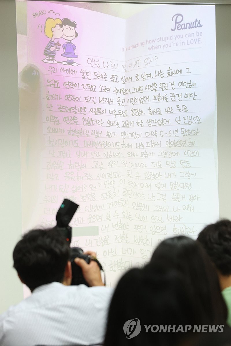 | ▲ 고 김새론 유족이 공개한 편지 (서울=연합뉴스) 강민지 기자 = 27일 서울 서초구 스페이스쉐어 강남역센터에서 열린 고 김새론 유족 기자회견에서 법률대리인 부지석 변호사가 관련 자료를 공개하고 있다. 2025.3.27 mjkang@yna.co.kr |