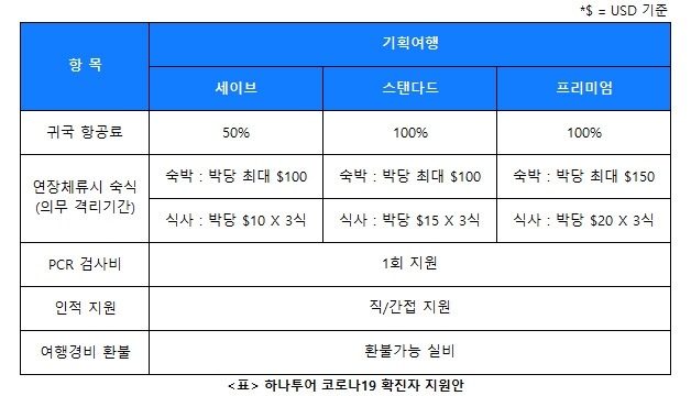 항공권의 경우 현지 격리로 귀국일을 변경할 경우 1회에 한해 재발권을 지원하고 귀국일 변경이 불가한 항공권은 신규 발권을 지원한다. 프리미엄과 스탠다드는 100%, 세이브는 50% 지원한다.