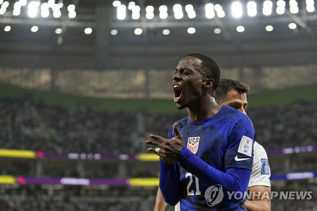 | ▲ 웨일스 상대 선제골 넣은 '라이베리아 대통령 아들' 티머시 웨아 (알라이얀 로이터=연합뉴스) 21일(현지시간) 카타르 알라이얀에서 열린 2022 국제축구연맹(FIFA) 카타르 월드컵 조별리그 B조 미국 대 웨일스 경기에서 미국의 티머시 웨아(22·릴OSC)가 선제골을 넣은 뒤 기뻐하고 있다. 아프리카 라이베리아의 전설적인 축구선수였던 조지 웨아(56) 라이베리아 대통령의 아들인 그의 활약에 힘입어 미국은 웨일스와 1-1 무승부로 경기를 마쳤다. 2022.11.22 alo95@yna.co.kr |