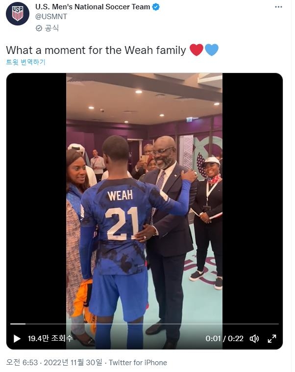 미국 축구대표팀과 FIFA는 30일(한국시간) 사회관계망서비스(SNS) 계정에 웨아 대통령과 아들 웨아가 만나 부자의 정을 나누는 동영상을 공유했다.