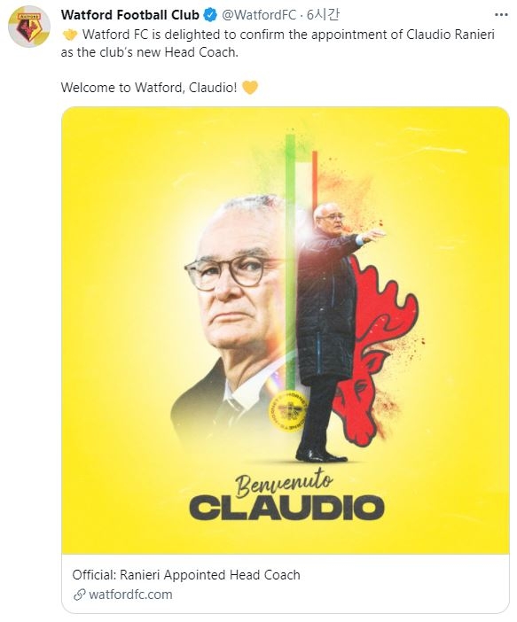 | ▲ 왓퍼드, 라니에리 감독 선임 [왓퍼드 트위터 캡처. 재판매 및 DB 금지] |