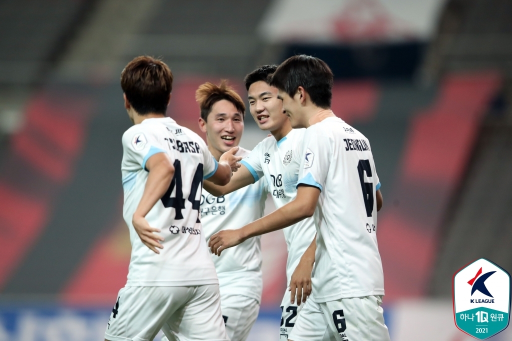 ▲ 정치인 동점골에 기뻐하는 대구 선수들 [한국프로축구연맹 제공. 재판매 및 DB 금지]