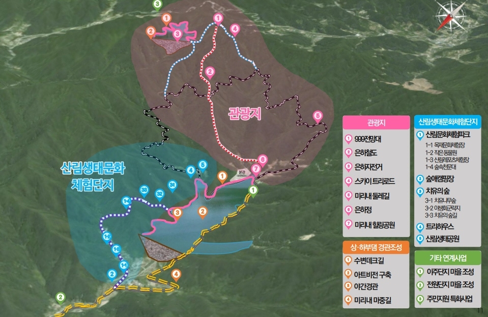 군은 양수발전소 하부댐 위쪽에 전망대, 모노레일, 둘레길, 쉼터, 힐링공원 등으로 구성된 관광지를 조성할 계획이다.