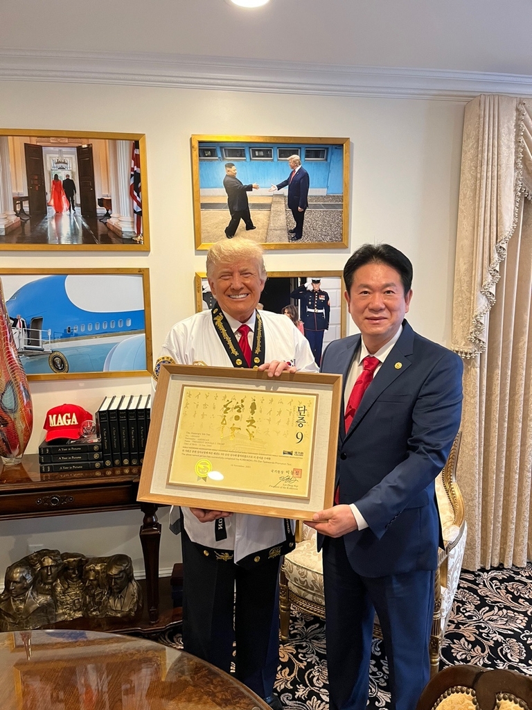 국기원에 따르면 이동섭 국기원장이 현지시간 19일 오후 4시 트럼프 전 대통령의 별장인 미국 플로리다주 팜비치의 마러라고 리조트를 직접 방문해 명예 9단증을 수여하고 태권도복을 증정했다.
