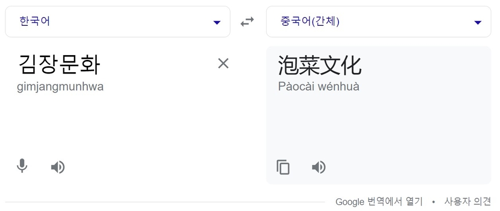 (서울=연합뉴스) 왕길환 임성호 기자 = 구글 번역기에서 한국어로 '김장문화'를 입력하면 중국어로 '파오차이문화'(泡菜文化)로 번역되는 것으로 나타났다.